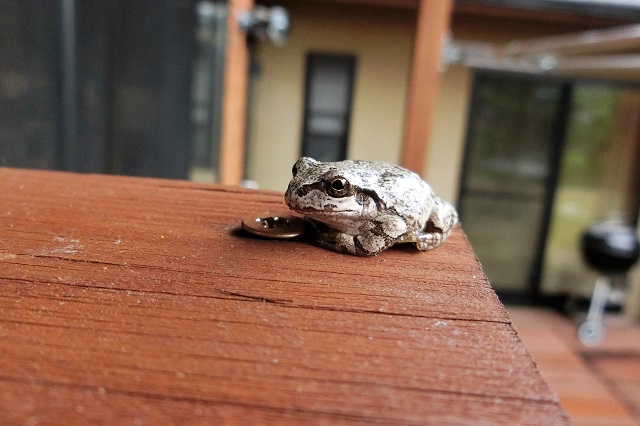 右側が玄関で、巣の下はウッドデッキの出入り口です。