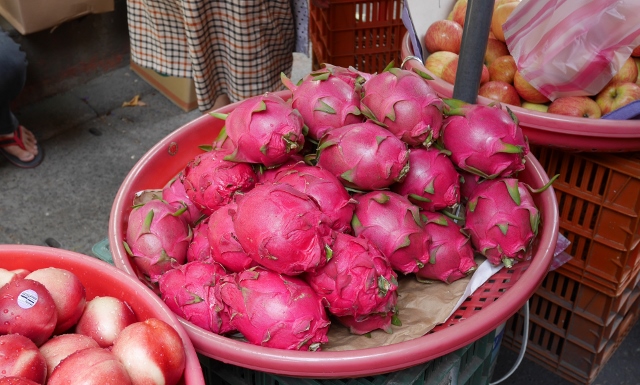 ドラゴンフルーツは何処でも山積み。綺麗な色に目を魅かれます。