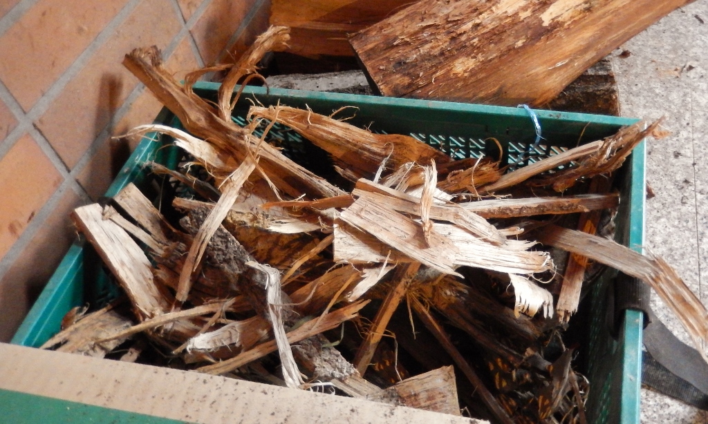 夫は、まめに薪割り後の木っ端を集め、きちんと焚きつけ用に乾燥させている。これがあると、火を入れるのがとても楽だ。小枝なども焚きつけに使うが、木っ端の方が断然よく燃える。木っ端達は、薪ストーブに火を入れる際とっても頼りになるやつらなのだ。