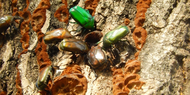 木の上の方ではカナブン達が、蜜採りバトル真っ最中でした。