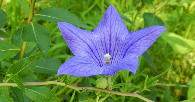 庭では桔梗が咲き始めました。幾何学的な不思議な形と深い紫色。