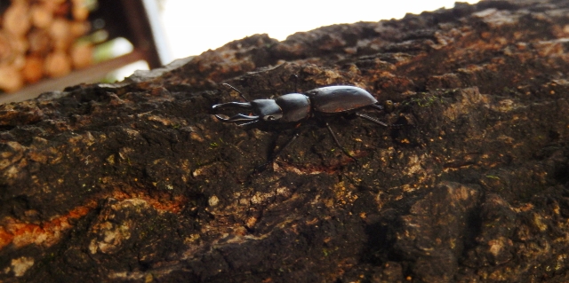夫が呼ぶので庭に出てみると、彼は隣りの林のクヌギの木を見上げていた。昆虫酒場と呼んでいるクヌギで、幹の樹液を虫達が吸いに来る昆虫スポットだ。ついこのあいだまでは、蝶だらけだったが、見ると大きなカブトムシがいた。