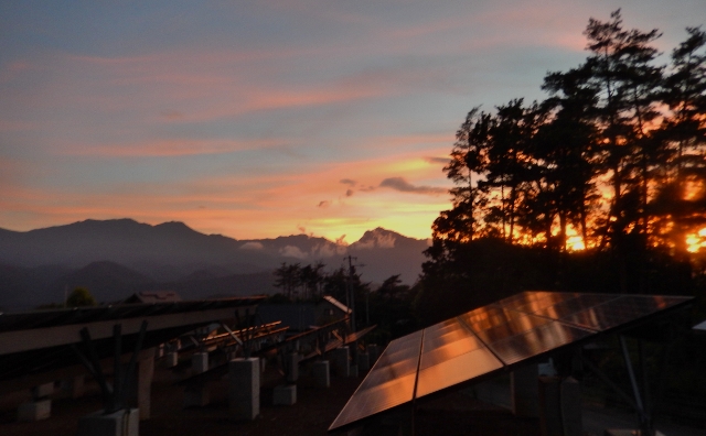 南側に建てられたソーラーパネルにも、夕焼けが映っていました。
