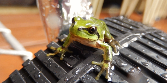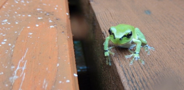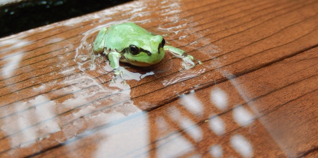 雨。ウッドデッキには、たくさんのけろじ達が集合している。我が家では、ウッドデッキにのぼってきたアマガエルをみな「けろじ」と呼んでいるのだ。