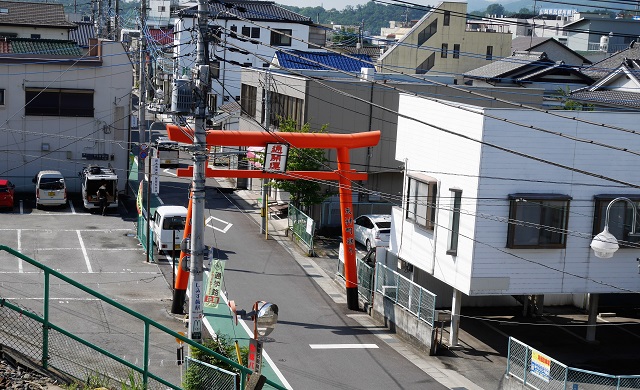ホームから見下ろした大きな鳥居。学問の神様が祭られているとか。