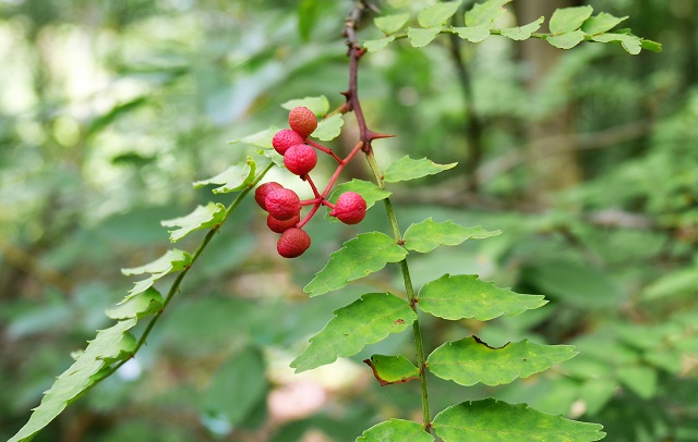 山椒は赤い実がはじけて、艶やかな黒い種が顔を出していました。