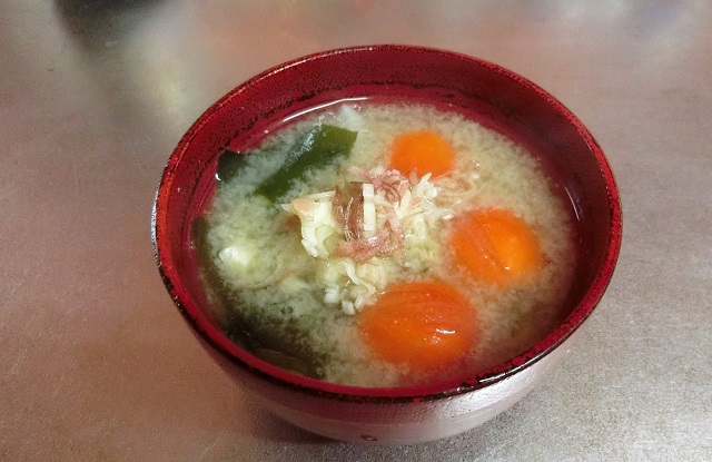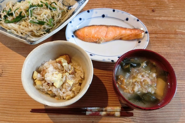 なめこ、若芽、油揚げ、大根に茗荷の味噌汁、塩鮭、モヤシとニラのナムル。