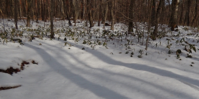 我が家の周辺と違うのは、雪の量だけではなく、同じ松林でも赤松ではないということが判る。赤松よりは、ずいぶんと小ぶりのマツボックリが、枝についたまま落ちていたからだ。落葉針葉樹の落葉松(からまつ)だそうだ。見上げると青空のなか、マツボックリたちの影が、小さく小さく見える。その下には、雪をかぶった石。雪が解けだしたところには、落ちた松葉に守られた苔が、瑞々しく光っている。