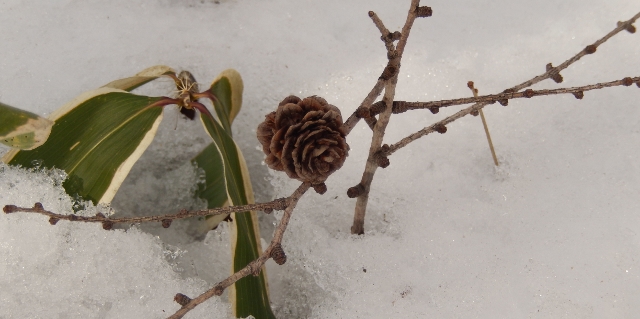 雪のなかの、この松林には、春待つ命があふれているのだ、と。そう思った途端、何か判らぬ乾燥した蔓の実が、マツボックリが、落葉松の木肌が、陽を浴びる苔が、林全体が、美しく見えてきた。