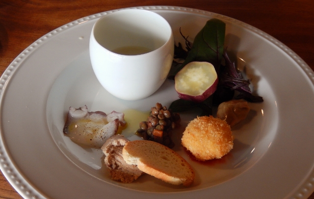 前菜、少しずついろいろが嬉しい。ひよこ豆と里芋のスープ。
