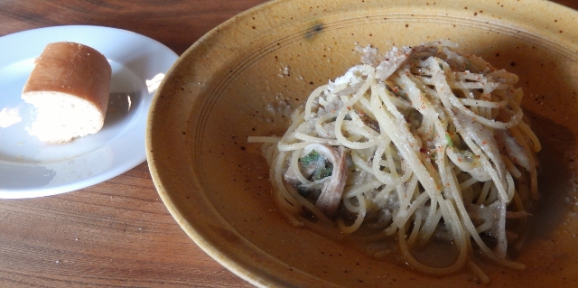 ランチパスタ。わたしは鶏と牛蒡のニンニクソース。