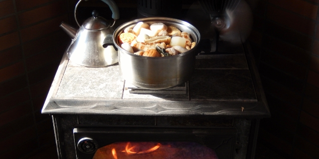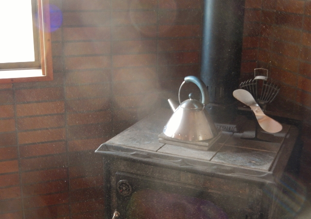 薪ストーブの燃え残った火の上、まだ温かいやかんのなかの白湯。魔法瓶のなか、前日の残りの湯がゆっくりと温度を落としていった白湯。