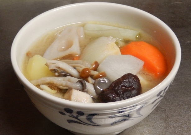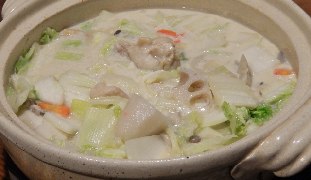 夫が、目をつけたのは、白い鍋だった。骨付き鶏もも肉や、里芋、蓮根などを煮て、味噌と豆乳で味つけしたものだ。
