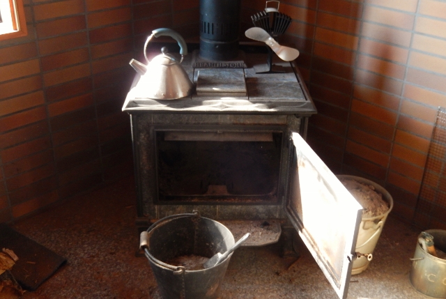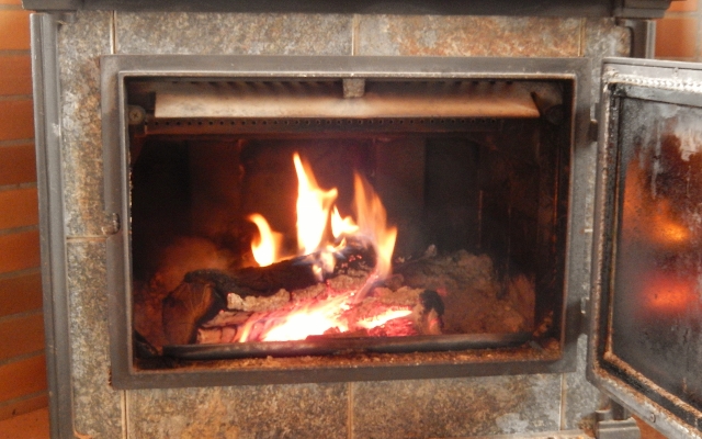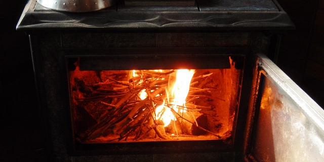 薪ストーブ周辺に射しこむ、陽の光。早く春が、来ないかなぁ。