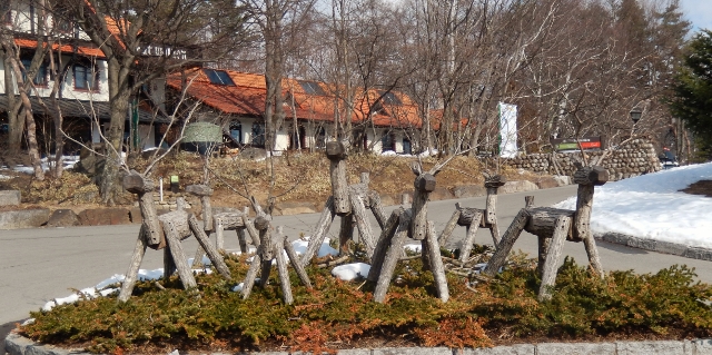 『萌木の村』トレードマークの木製トナカイ達が、入口でお出迎え。