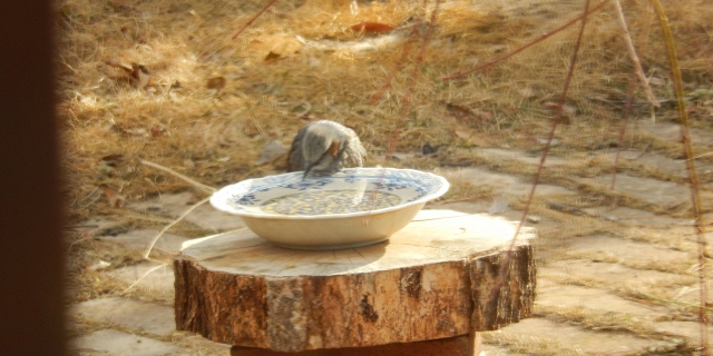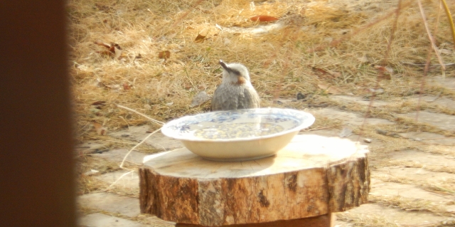 庭では、ヒヨドリが、水場でうがいしていました。