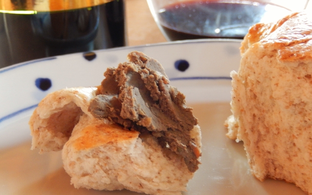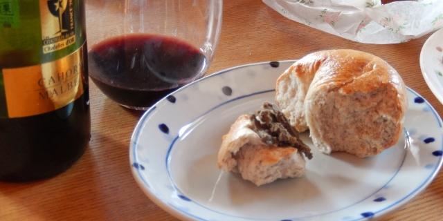 前日に、夫が作ったレバーペーストを塗って、赤ワインをあけて。