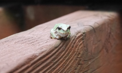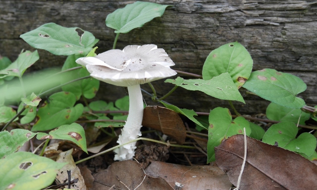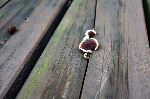 ウッドデッキに顔を出したキノコさん。そこ、困るんですけど。
