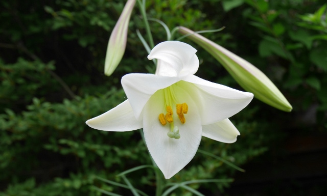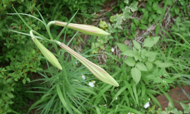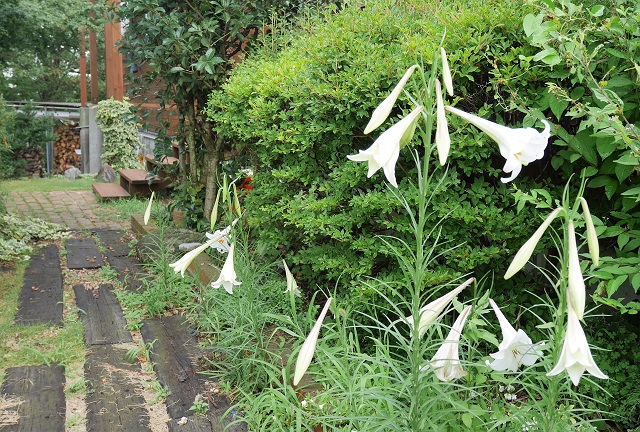 夏、雨上がりの朝の庭です。テッポウユリが次々咲いていきます。
