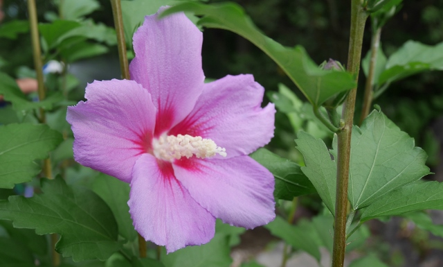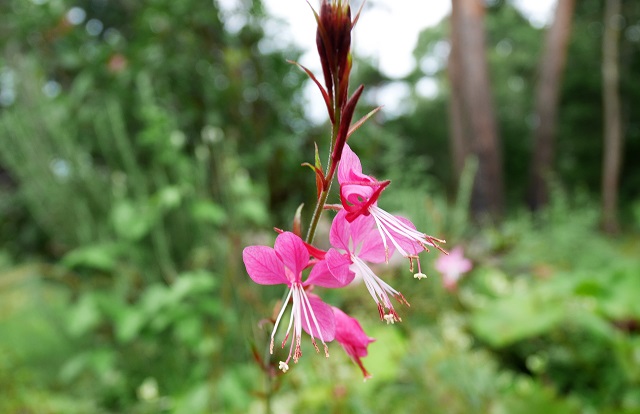 ガウラが、濃いピンクの花を風に揺らしています。