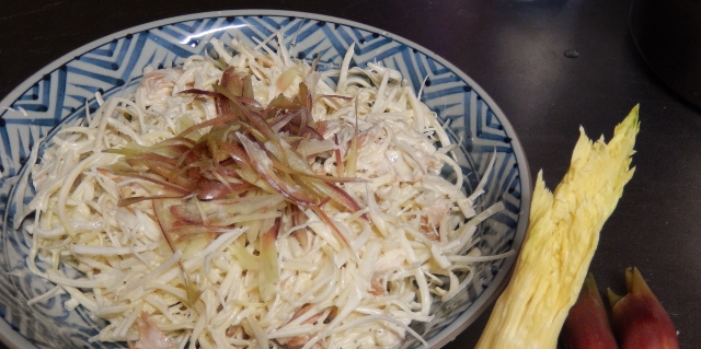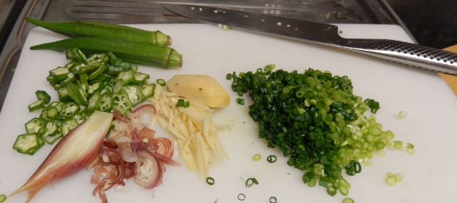 茗荷とオクラも、刻みました。生姜は針生姜に。
