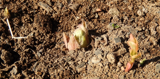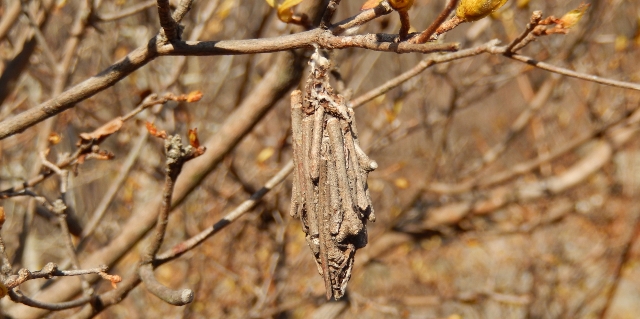 いつもは、ただ通過するだけの玄関の石段をゆっくり歩く。すると、まだ息吹の時を迎えていないツツジに、ミノムシを見つけた。数えると、なんと7匹もいる。やはり大雪を予測していたのだろうか、高いところにばかり。それでも、元々1mないツツジは、雪の中に埋もれてしまったが。カマキリの卵も例年より高く、50㎝以上ある位置に産み付けられていたが、やはり雪に埋もれていた。ぶじ生まれて来るのだろうか。