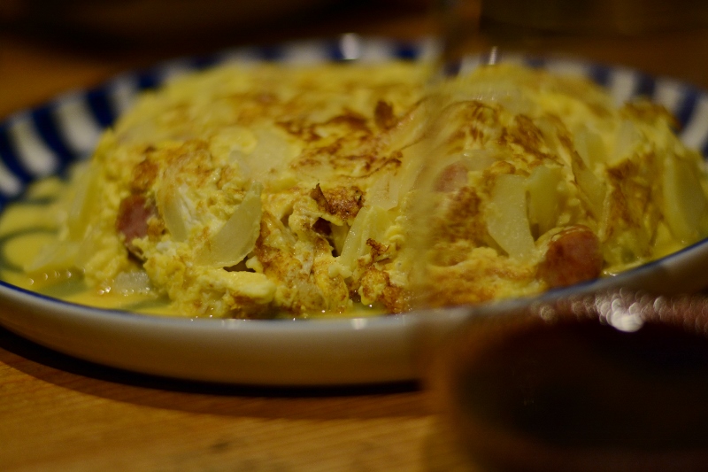 夫が一眼レフで撮った、赤ワイン越しのスペイン風オムレツです。
