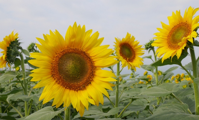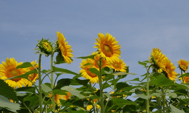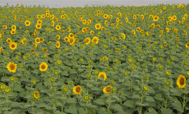 そんな研ぎ澄まされた朝だから、そうだ、向日葵を見に行こうと思い立った。夫を駅まで送った帰り道、少し遠回りをするだけでいくつかの向日葵畑を見て回れる。週末から『サンフラワーフェス』が始まった。明野町がまだ村だった頃、村おこしで始められた向日葵畑は、20もの場所で順番に咲いていくように植えられているのだ。