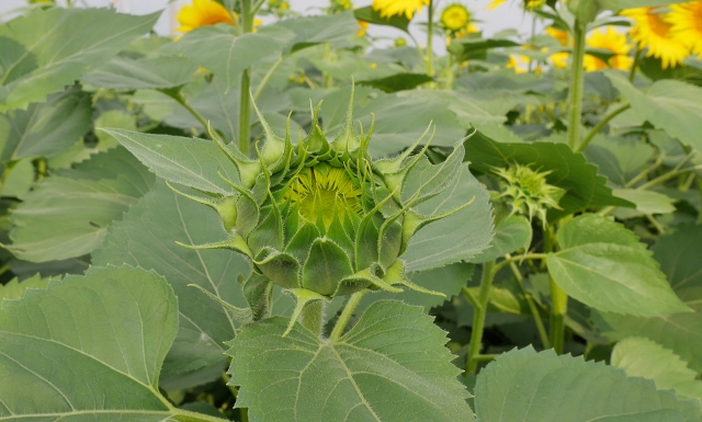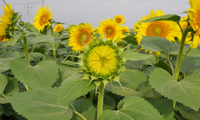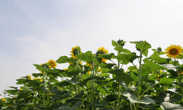 思った通り、向日葵一輪一輪が、くっきりと見えた。いつもなら目を向けない蕾や、ハート形のような葉や、後ろ姿も楽しく眺めた。上を向いて咲く花あり、うつむいた様子の花もあり、蜜を吸う蜂やアブのかすかな重みにふっと揺れる花もあり。そんな何でもない風景がそのままの姿ですっと胸に収まった。