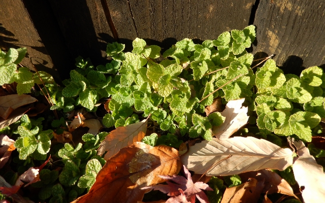 寒空の下、けなげに伸びるアップルミントも、あえなく薪の下敷きに。