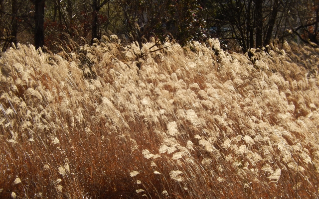 北風に吹かれて、同じ方向を向いたススキ野原。