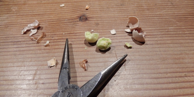 調べもせず、ラジオペンチで割ると、中身までぐしゃりと割れてしまった。
