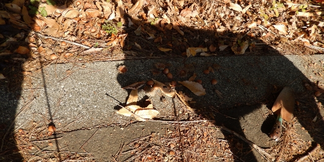 夫とふたりでびっきーと散歩する際、秋口からその場所を通る度に、疑問を抱き、話題にしていた。椎の木もクヌギも、そこ此処に生えていて、実もあちらこちらに落ちてはいるのだが、そこに落ちた実は、不思議な集中の仕方をしているのだ。今年は、猿をこの林で見かけるようになったこともあり、多分まあ猿が木を揺らしつつ実を食べたのだろうということで話は落ち着いていた。