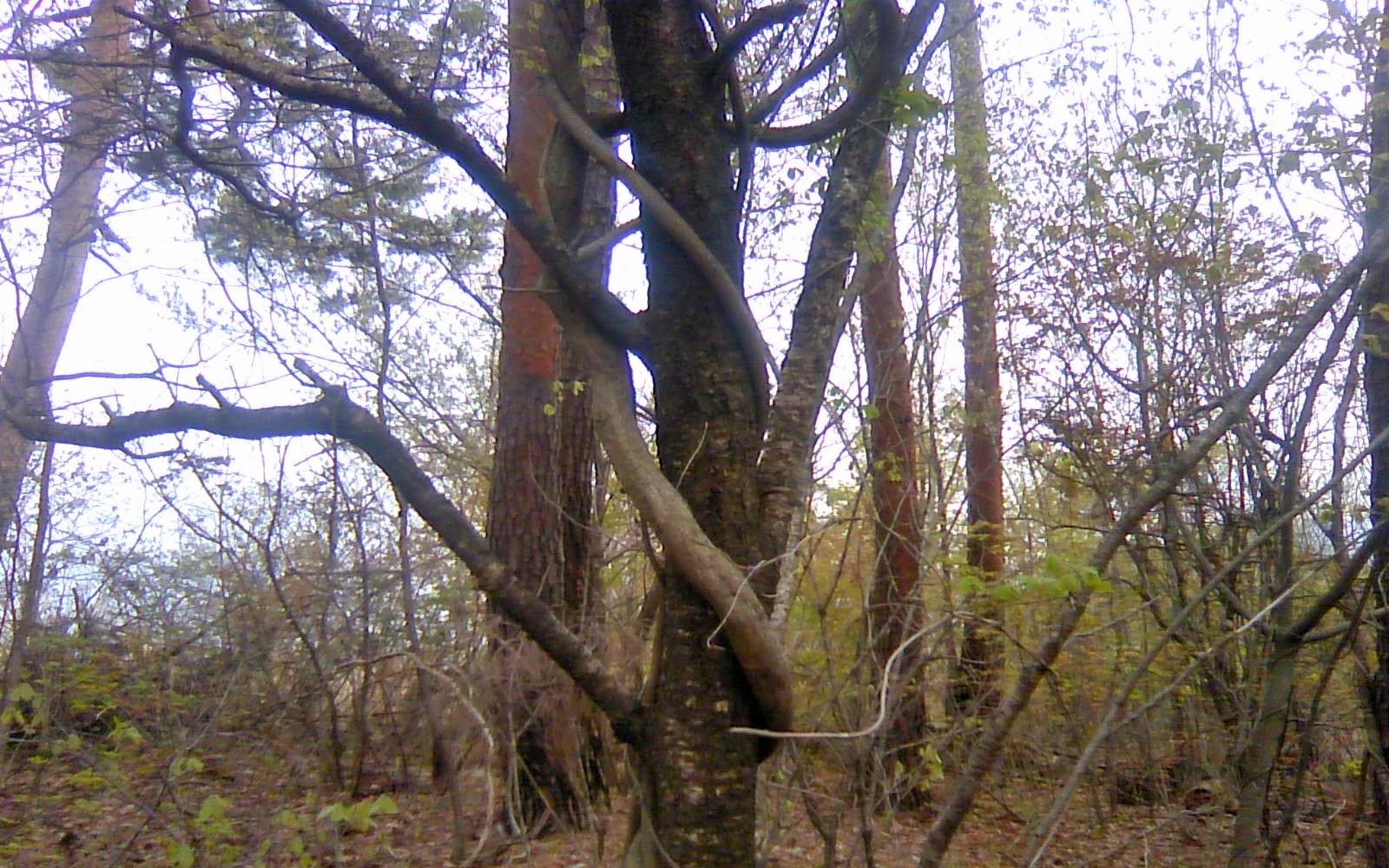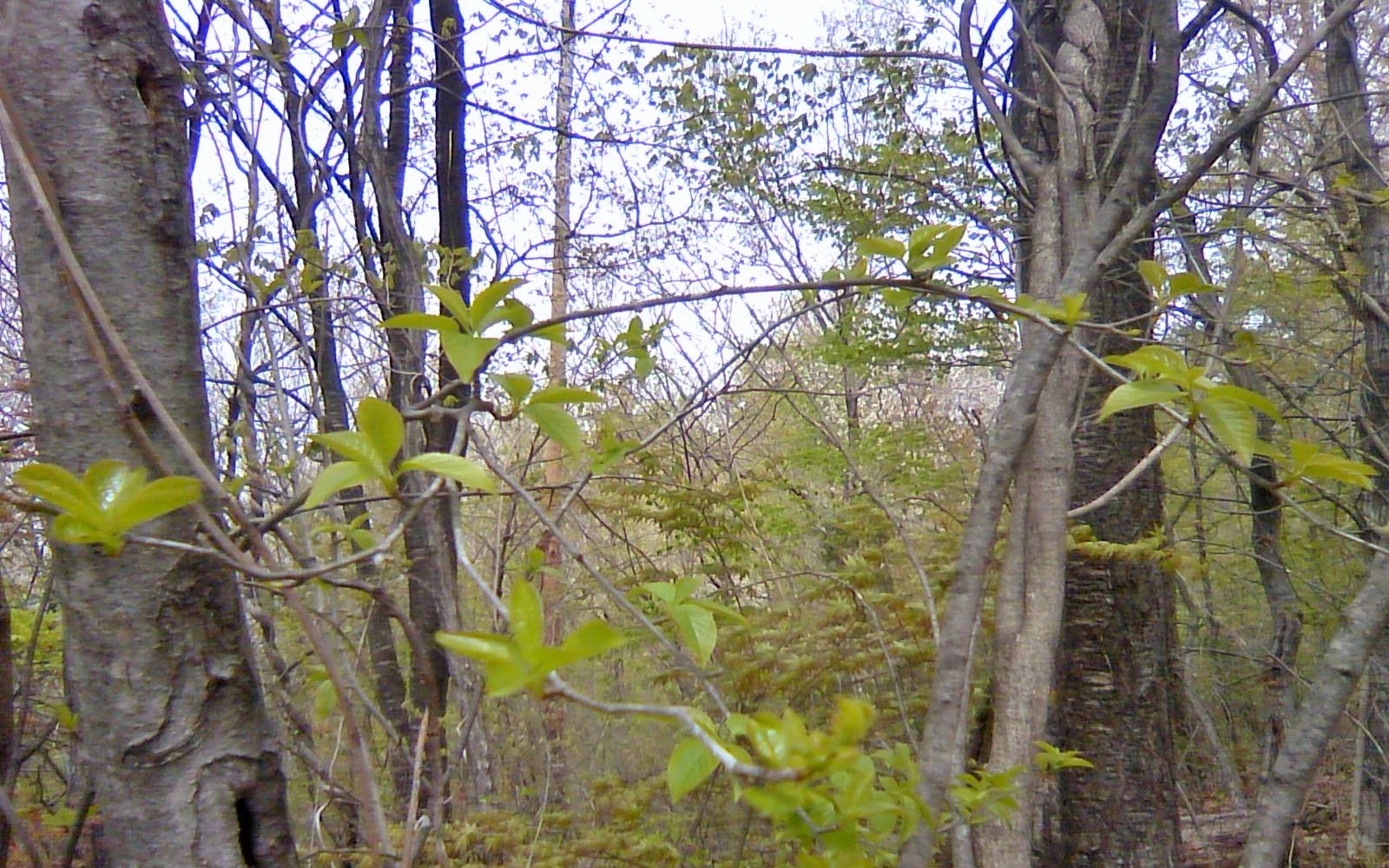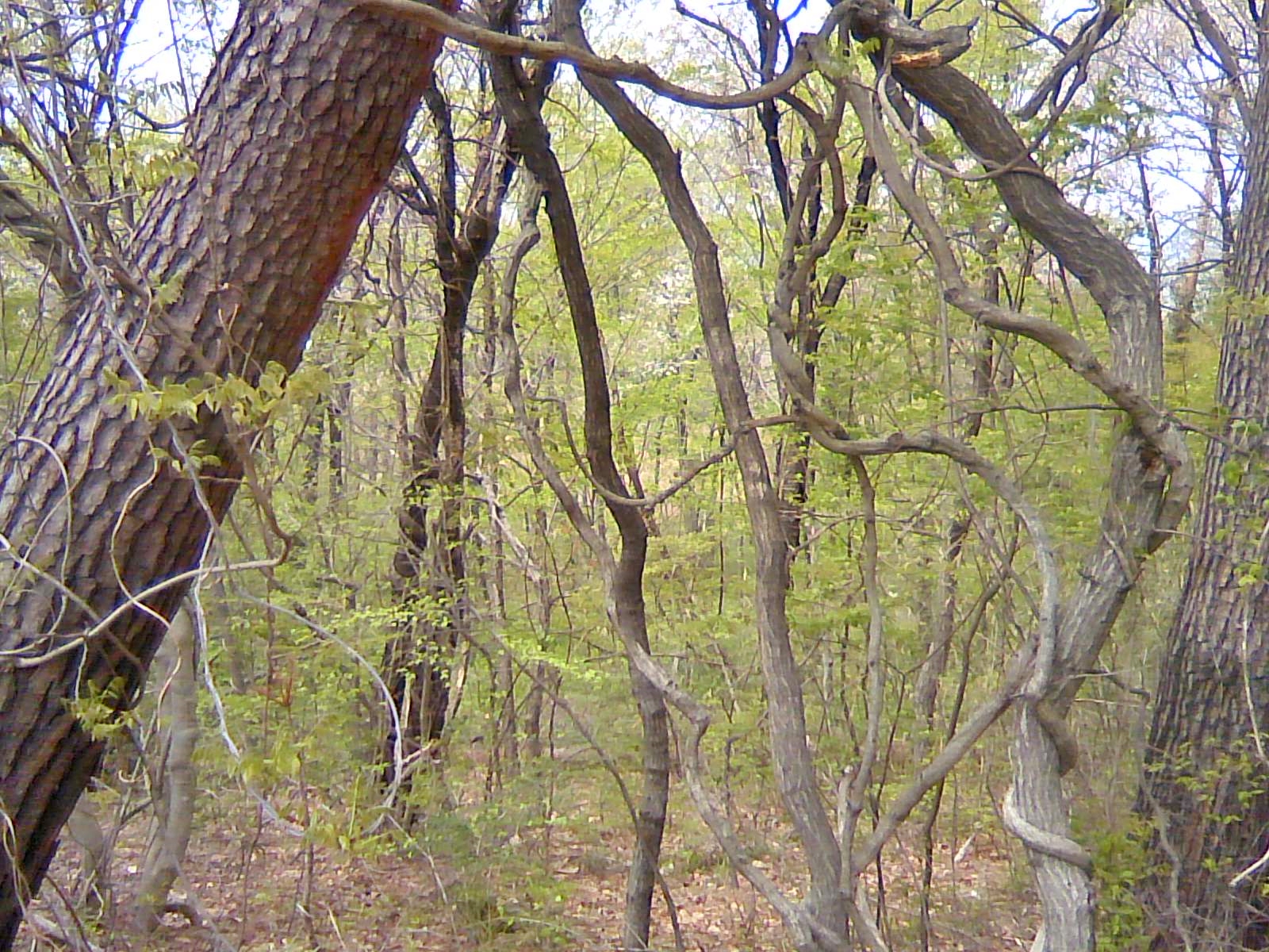 その木々にからみついた様々な蔓(つる)は、冬の間、まるで枯れたようにも見えた。だがその枝からも、小さなあくびをするかのように、ひとつ、またひとつと若葉が開いていく。古株の蔓は、からみついた木と変わらぬ太さになったものもあり、そんな蔓にからまれた木は、苦しみつつ空へ伸びているようにも見えるが、支え合っているかのようでもある。