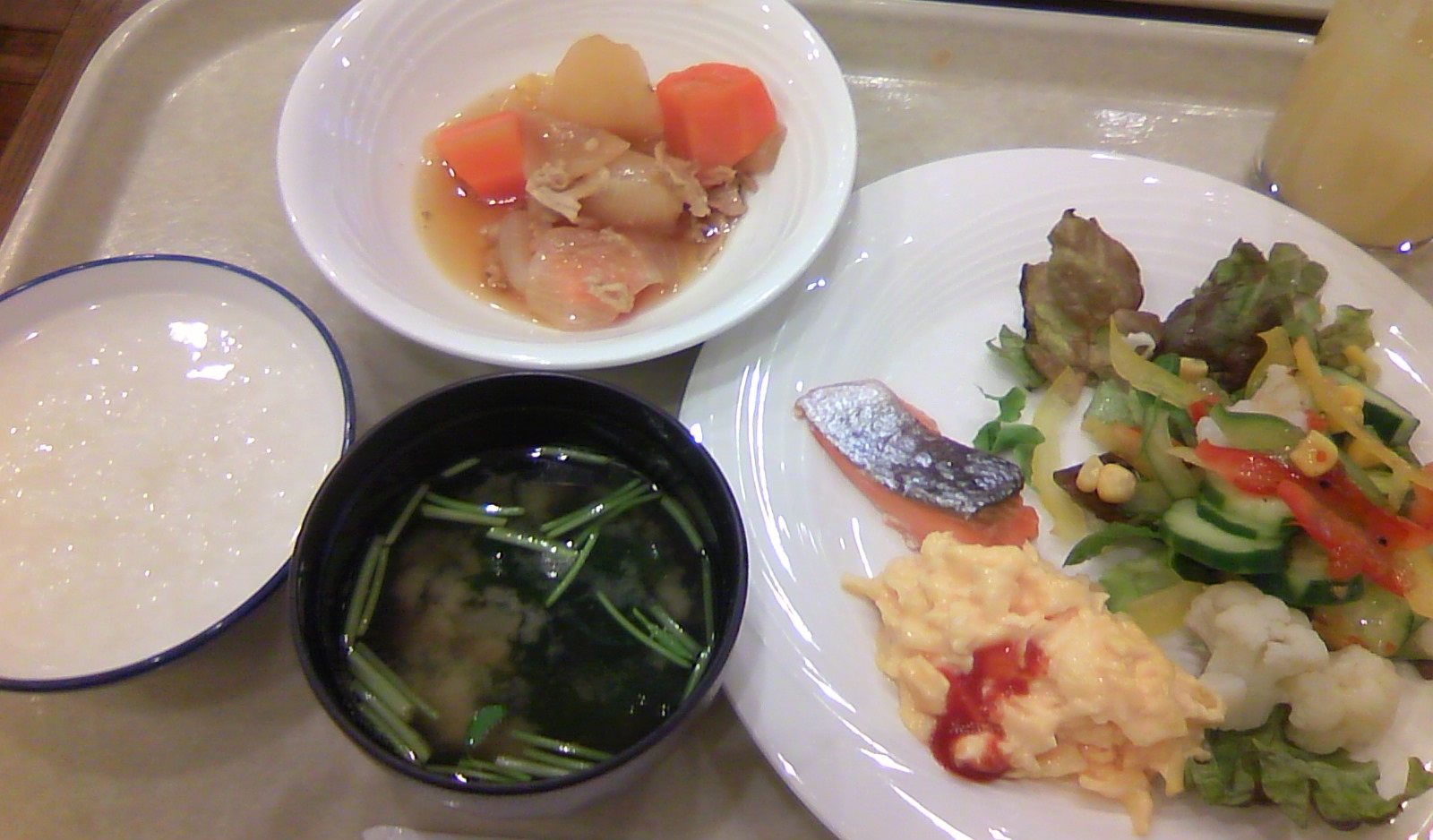 ブッフェの朝食。野菜がたくさん食べられるのがいいですね。