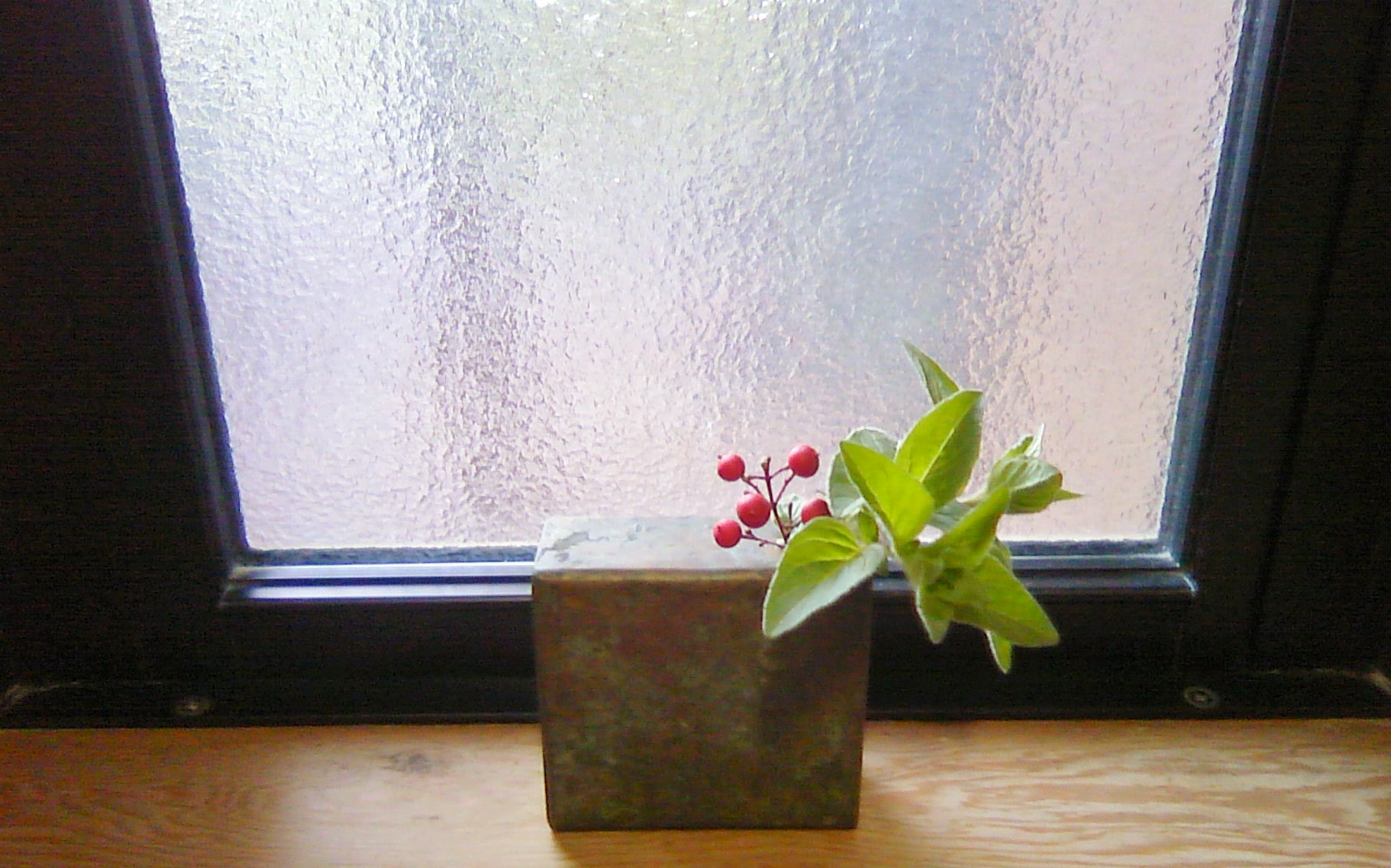トイレの窓に、庭のミントの葉を飾った。銅でできた一輪挿しを買い、草花を飾りたくなったのだ。
