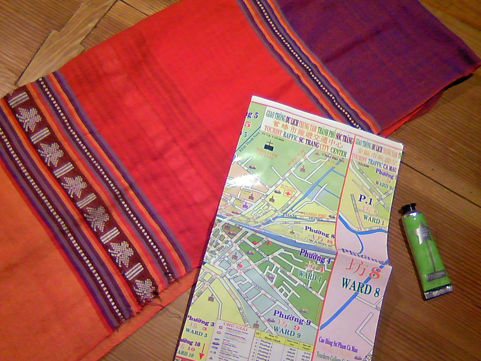 「お土産」と手渡してくれたのは、これからの季節にぴったりの薄手のショールだ。娘達の分と3枚ある中で、わたしは一番明るいオレンジ色を選んだ。アジアの布が好きなわたしは、さっそく巻いてみる。嬉しい。