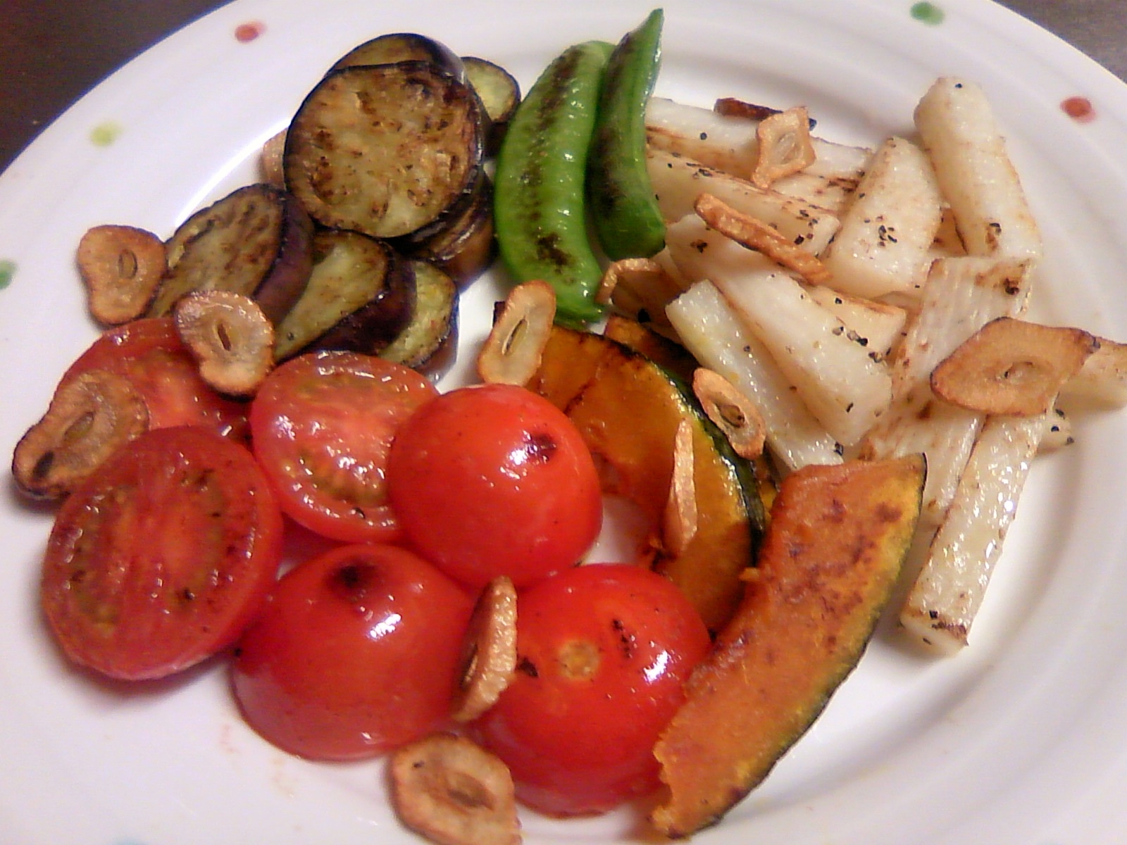 にんにくの匂いがついたオリーブオイルで野菜を焼き、塩胡椒。