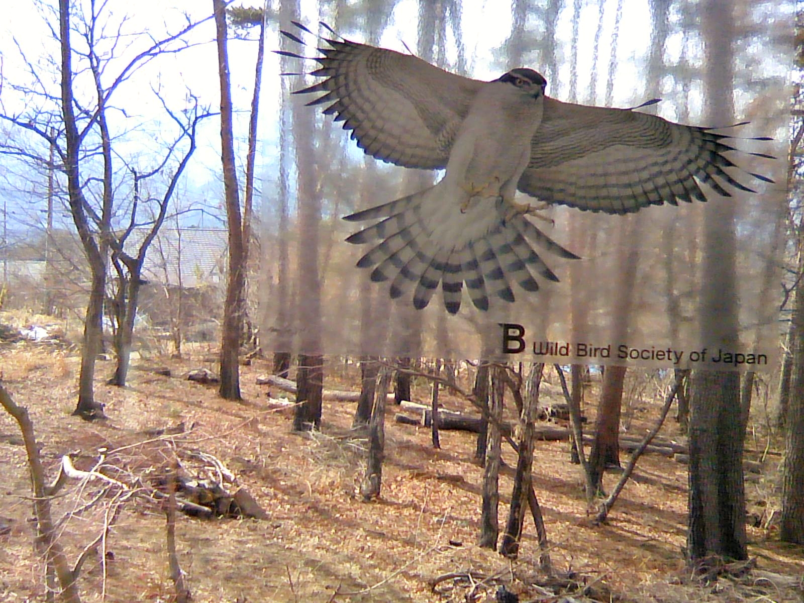 夫が一緒に立っている庭の一段下がった場所から、リビングの窓を見上げた。見上げると、窓には隣の林が映っている。林の木々の間には空が広がっている。ヤマガラは、そこへ飛んで行こうとしたのだ。