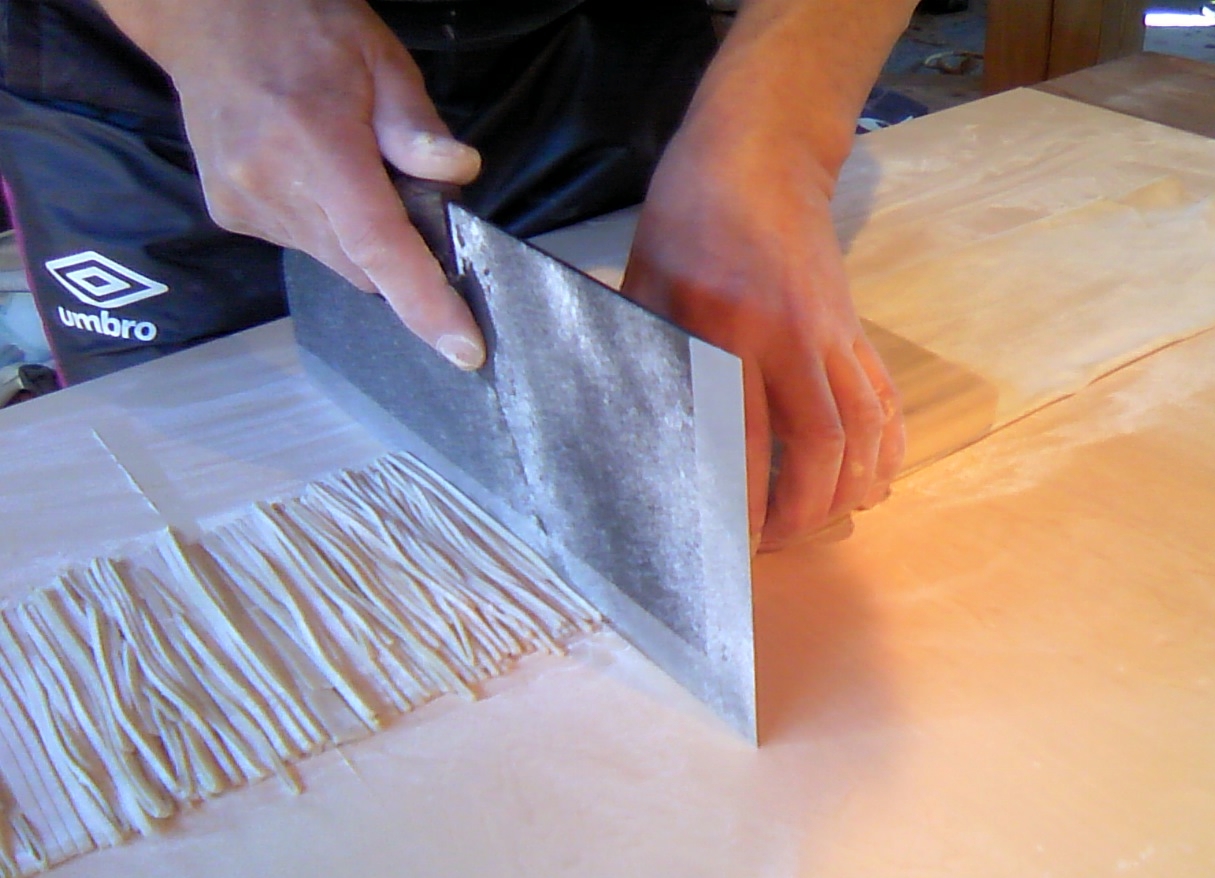 鮪と紫玉葱をメッツァルーナ(半月型包丁)で一緒に叩いたら、ピンク色に。