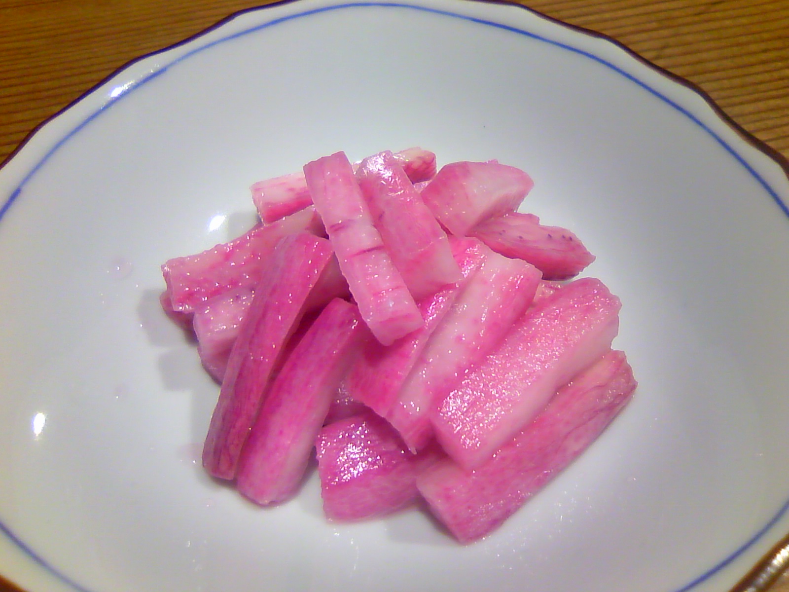 美味しい。さっぱりしていて後を引く美味さだ。ネット検索したレシピは、大根を切って調味料共に密封袋に入れて揉み1日置くだけ。簡単で美味しく、何よりピンク色に染まった大根が綺麗だ。