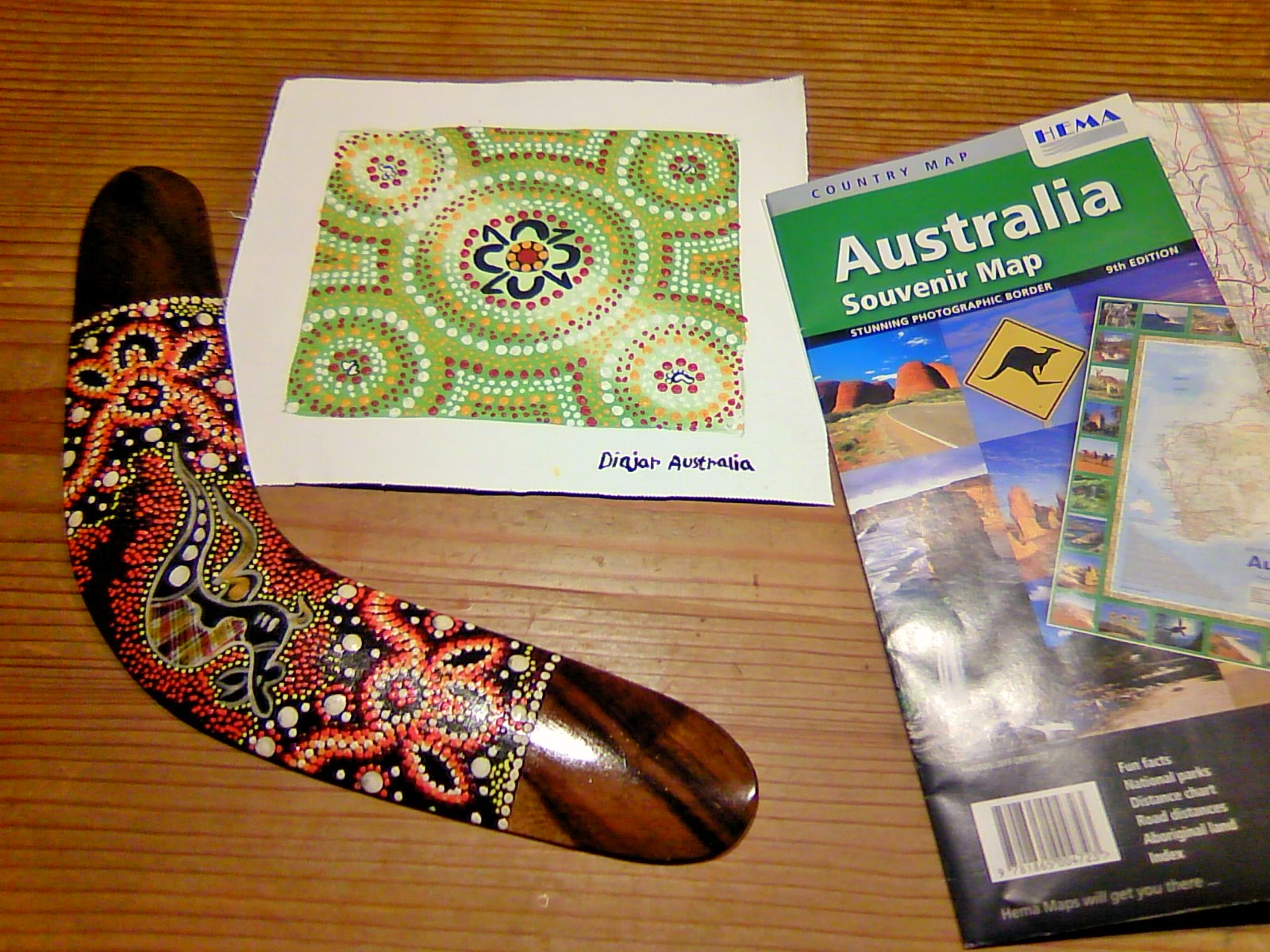 お土産のアボリジニアート。カンガルーを中心に描かれたブーメランが素敵。