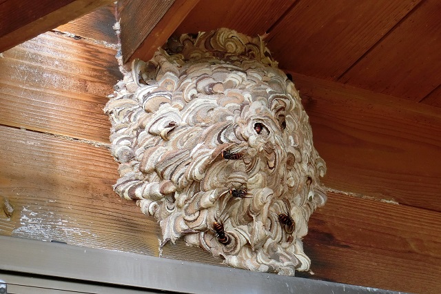 ご近所さんの玄関先に、キイロスズメバチが巣を作った。