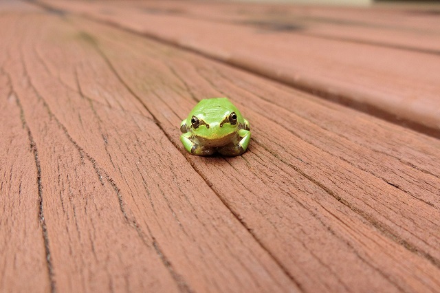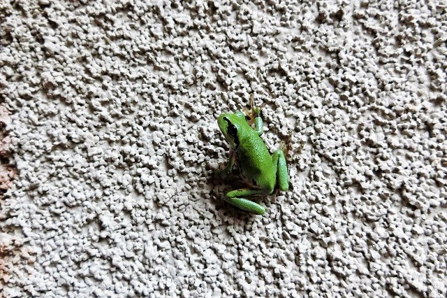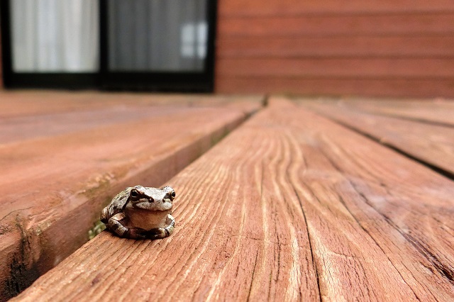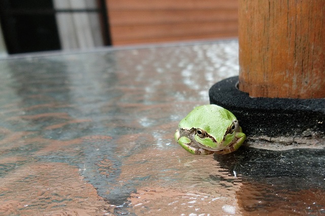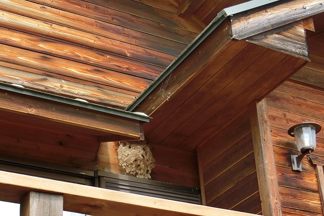 右側が玄関で、巣の下はウッドデッキの出入り口です。