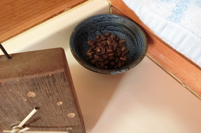 トイレの写真で失礼します。消臭剤代わりに古い珈琲豆を置きました。