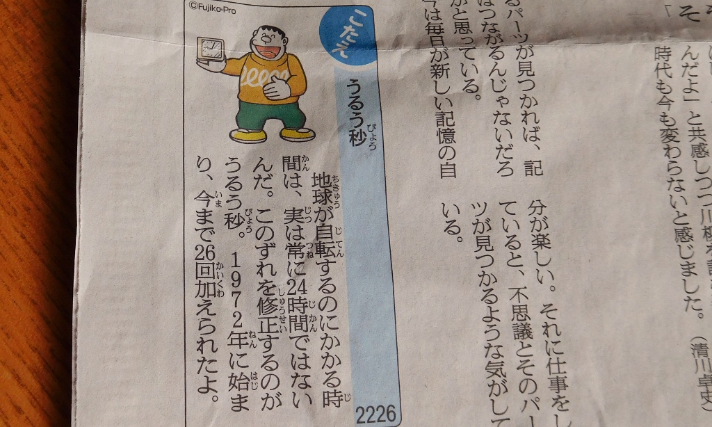 数日前の朝日新聞「しつもん! ドラえもん」のコーナーで「うるう秒」というのが取り上げられていた。カレンダーのわずかなずれを修正する4年に一度のうるう年のほかに、数年に1秒追加されるそうだ。そういうものがあるのだとは知らなかった。大人になっても、知らないことの何と多いことか。